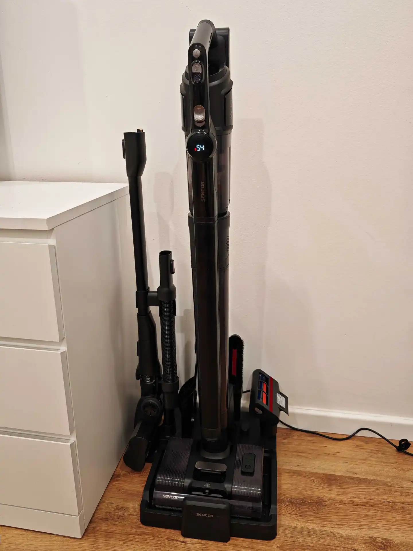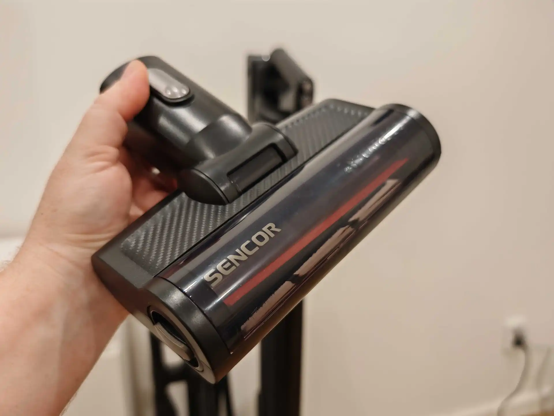 Na rukoväti vysávača nájdete hneď niekoľko tlačidiel. Tie slúžia na zapnutie zariadenia, nastavenie výkonu, zvýšené zvlhčenie podlahy pri mokrom upratovaní a na automatické pranie valcov v stanici. O stave zariadenia (nastavený výkon a výdrž) informuje dobre umiestnený displej. Jeho obsah sa otáča podľa toho, či sa Sencor nabíja v stanici, alebo s ním práve upratujete. Nemusíte sa tak pozerať na údaje hore nohami. Doplnenie batérie trvá približne 4,5 hodiny.